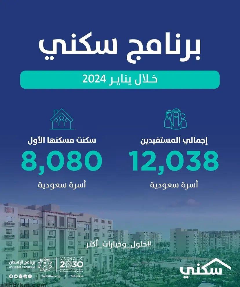 أعلن “سكني” عن استفادة 12,038 أسرة سعودية من البرنامج؛ وأن 8,080 أسرة سكنت مسكنها الأول خلال شهر يناير الماضي، وذلك في إطار الجهود المستمرة لتوفير منتجات سكنية متعددة وحلول تمويلية متنوعة تُسهم في تحقيق أهداف برنامج الإسكان