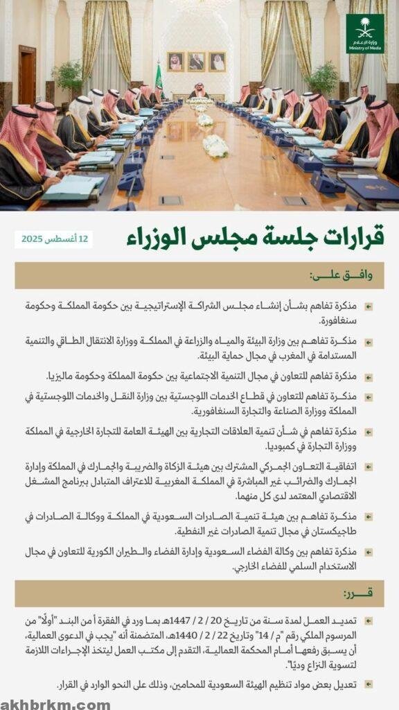 مجلس الوزراء يوافق على إنشاء مجلس الشراكة الإستراتيجية مع سنغافورة وتعديل تنظيم الهيئة السعودية للمحامين
