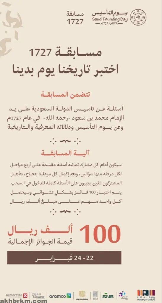 وتتضمن أسئلة عن تأسيس الدولة السعودية على يد الإمام محمد بن سعود -رحمه الله- في عام 1727م، وما يُمثّله هذا اليوم من فخرٍ كبير لدى السعوديين. وتتضمن المسابقة التي تأتي ضمن احتفاء الوزارة بيوم التأسيس، أسئلة متنوعة تدور في مجموعها حول يوم التأسيس، ودلالاته المعرفية والتاريخية، حيث سيكون أمام كل مشارك ثمانية أسئلة مُقسَّمةً على أربع مراحل، لكل مرحلة منها سؤالين،