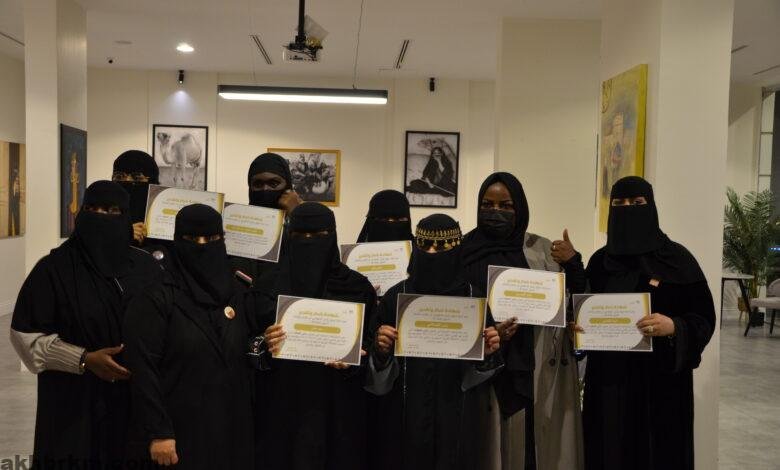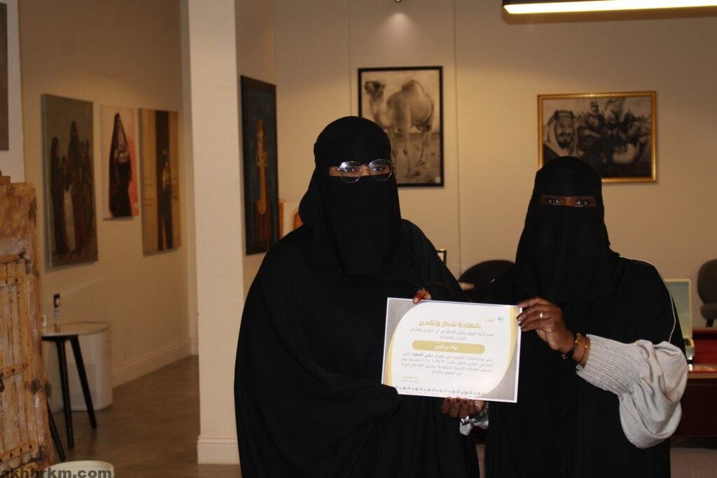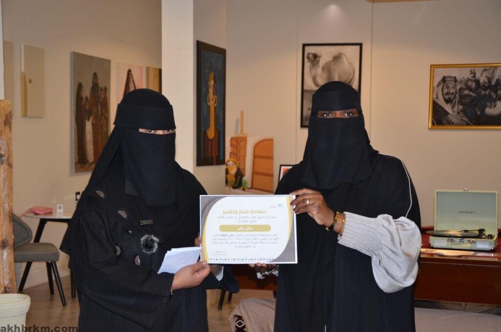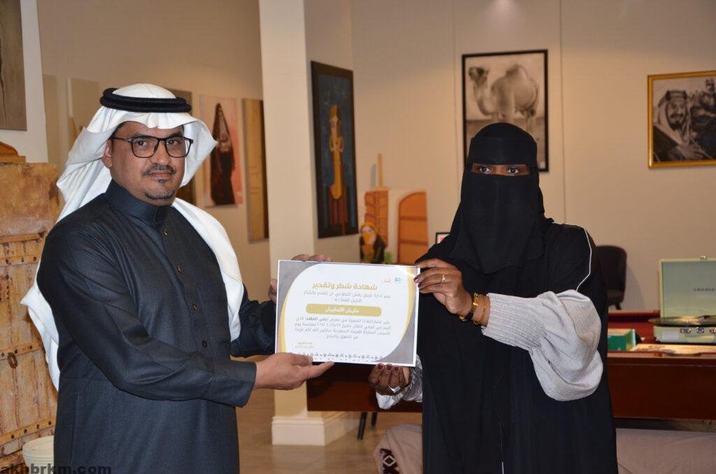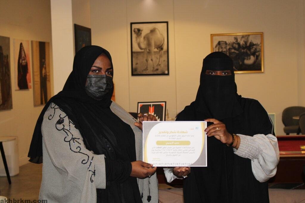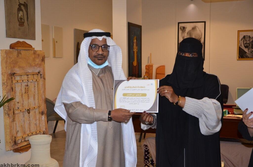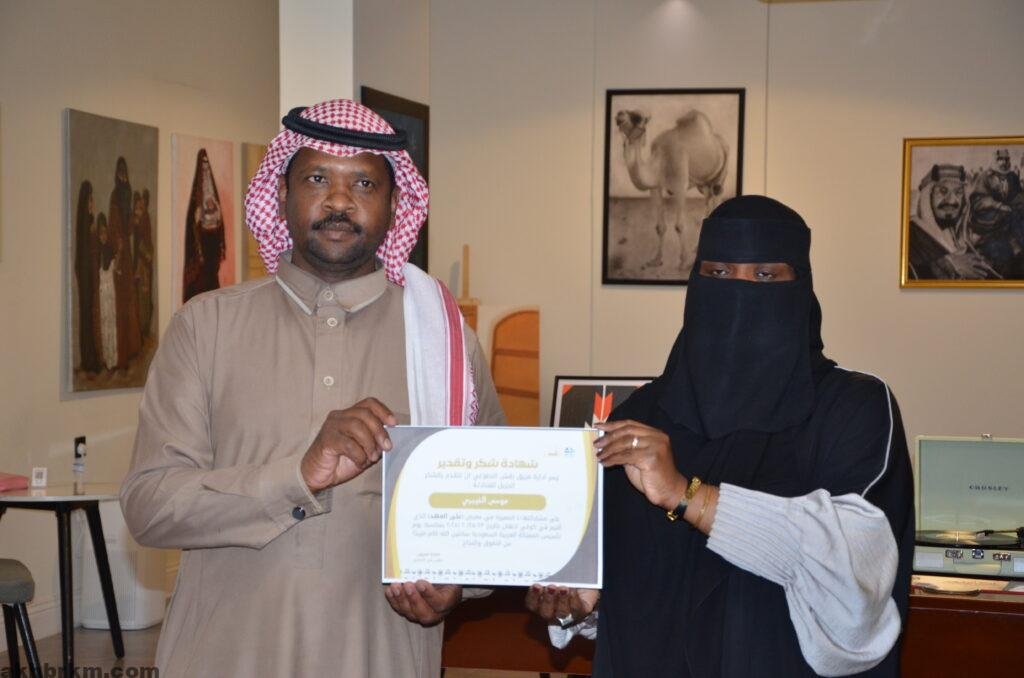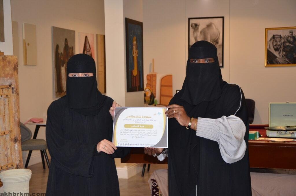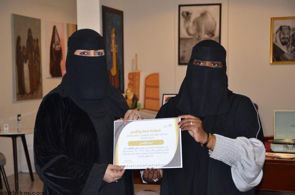 كما عبرت الفنانة التشكيلية /عبير الشامان عن سعادتها بنجاح معرض يوم التاسيس المسمي (علي العهد )مقدمه شكرها وتقديرها لأعضاء فريق رقش التطوعي ولكل من ساهم في نجاح هذا المعرض الذي يعبر عن أفراحنا بتأسيس هذا الوطن العظيم .