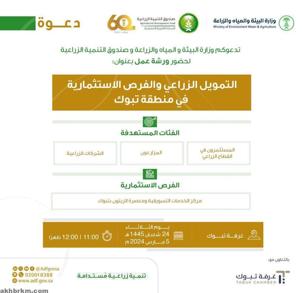 يسر غرفة تبوك بالتعاون مع وزارة البيئة والمياه والزراعة و صندوق التنميةالزراعية دعوتكم لحضور ورشة عمل بعنوان (التمويل الزراعي والفرص الاستثمارية في منطقة تبوك) .