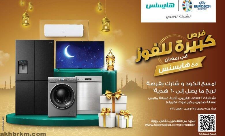 يدعو العرض الترويجي الكبير فرص كبيرة للفوز في رمضان مع هايسنس ، المستمر من 5 مارس 2024 حتى 2 أبريل 2024، العملاء إلى استكشاف عالم من الفرص و العروض على منتجات هايسنس الفاخرة في المتاجر الأجهزة الإلكترونية الكبرى في جميع أنحاء المملكة، منها متاجر التجزئة المعروفة مثل لولو وإكسترا، بالإضافة إلى العديد من المتاجر الأخرى. ويُتيح هذا العرض للعملاء فرصة للفوز بأكثر من 60 هدية مع عروض مذهلة على منتجات هايسنس خلال شهر رمضان.