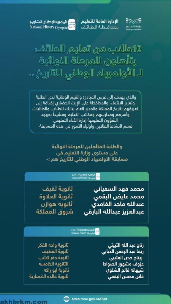 تأهل 10 طلاب من الإدارة العامة للتعليم بمحافظة الطائف للمرحلة النهائية من الأولمبياد الوطني للتاريخ 2024 على مستوى المملكة وهم :-محمد فهد السفياني ثانوية ثقيف ، محمد عايض البقمي ثانوية العلاوة ، عبدالله ماجد الغامدي ثانوية هوازن ، عبدالعزيز عبدالله البارقي شروق المملكة ، رتاج عبد الله الثبيتي ثانوية واحه الفكر، ريما عبد الرحمن الذيابي ثانوية العطيف ، ريتاج جدى العتيبي ثانوية حفر كشب ، عزوف مشهور الصواط الثانوية الخامسه ، شيهانه فالح الشلوي ثانوية ابو راكه ، فاتن محسن البقمي ثانوية خالده الانصارية.