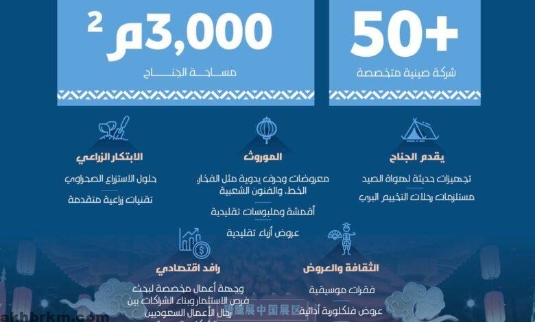 ويقدّم الجناح الصيني منظومة متكاملة من الخدمات على مساحة (3000) متر مربع، تشمل حلول الاستزراع الصحراوي والتقنيات الزراعية المتقدمة التي تواكب مستهدفات المملكة في مجال الاستدامة، إضافة إلى تجهيزات حديثة مخصصة لهواة الصيد ورحلات التخييم البري والطائرات من دون طيار والأطعمة الصينية.