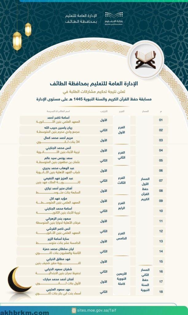 أعلنت إدارة التعليم بمحافظة الطائف نتائج تحكيم مشاركة الطلبة في مسابقة “القرآن الكريم والسنة النبوية” للعام 1445 هـ على مستوى الإدارة .