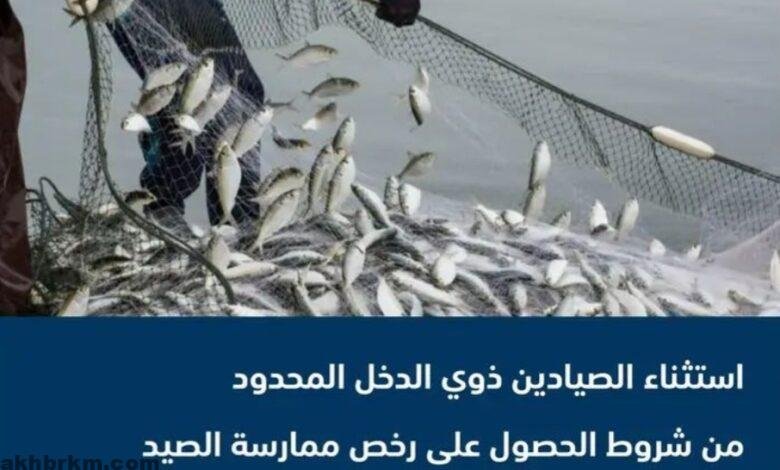 استثنت وزارة البيئة والمياه والزراعة، الصيادين ذوي الدخل المحدود من شروط الحصول على رخص ممارسة الصيد، لزيادة دخل الصيادين وتحسين معيشتهم وتحفيزهم على رفع الإنتاج، والمساهمة في تحقيق الأمن الغذائي، ودعم وتعزيز قطاع الثروة السمكية.