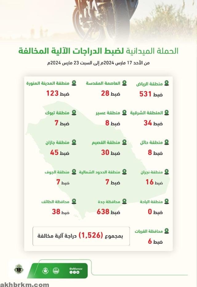 نجحت الحملات الميدانية لإدارات المرور السعودي لضبط الدراجات الآلية المخالفة في مختلف المناطق في ضبط 1526 دراجة مخالفة خلال الفترة من 17 مارس إلى 23 مارس الجاري.