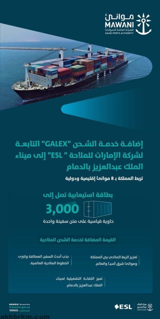 أعلنت الهيئة العامة للموانئ “موانئ” عن إضافة شركة الإمارات للملاحة ” ESL Emirates Shipping Line” خدمة الشحن الملاحية الجديدة “GALEX” إلى ميناء الملك عبدالعزيز بالدمام، التي تربط المملكة بموانئ شرق آسيا؛ ممّا يعزّز الربط الملاحي بين المملكة والعالم، ويؤكّد تميز الكفاءة التشغيلية للميناء.