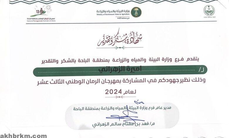 كرم فرع وزارة البيئة والمياه والزراعة بمنطقة الباحة الإعلامية اميره صالح الزهراني المحرره الصحفية في صحيفة “اخباركم” الاعلاميه في ختام مهرجان الرمان نظير جهودها الصحفيه المتميزة في إبراز أنشطة الفرع وبرامجه
