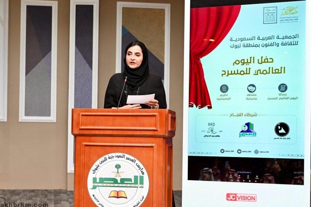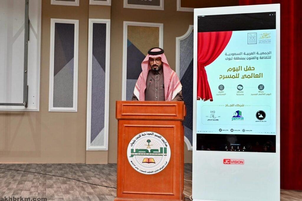 نضمت الجمعية العربية السعودية للثقافة والفنون بمنطقة تبوك برنامج احتفالية اليوم العالمي للمسرح والذي يصادف ال27من شهر مارس من كل عام ميلادي علي مسرح مدارس العصر النموذجية بحي الراجحي وسط حضور مدير عام التعليم بمنطقة تبوك الاستاذ ماجد العقير والأستاذ ماجد بن ناشئ العنزي مدير الجمعية العربية للثقافة والفنون بتبوك والضيوف والإعلامين والمهتمين بصناعة المسرح .