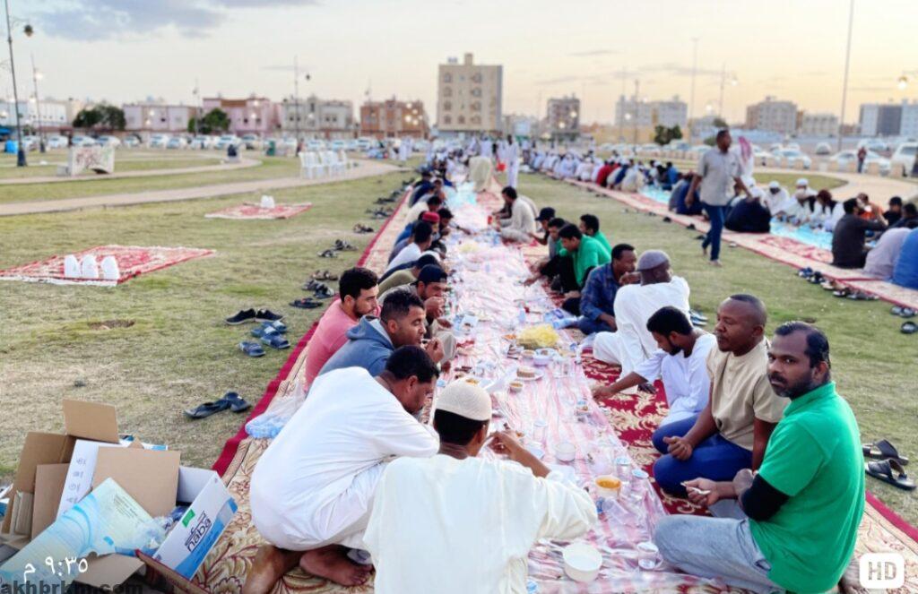 كما جرت العادة منذ سبع سنوات في احدى حدائق تبوك العامة حيث توافد العديد من الأشقاء السودانيين العاملين في مدينة تبوك في كافة المهن مابين طبيب ومهندس وبائع وغيرها من المهن الي موقع الإفطار الجماعي تلبية لدعوة الاستاذ الطيب الشليبي صاحب المبادرة المستمرة منذ سبعة أعوام محملين بمختلف أصناف الأكلات الشعبية السودانية كالويكة والعصيدة السودانية والقهوة السودانية الشهيرة (الجبنة) بكسر الجيم .