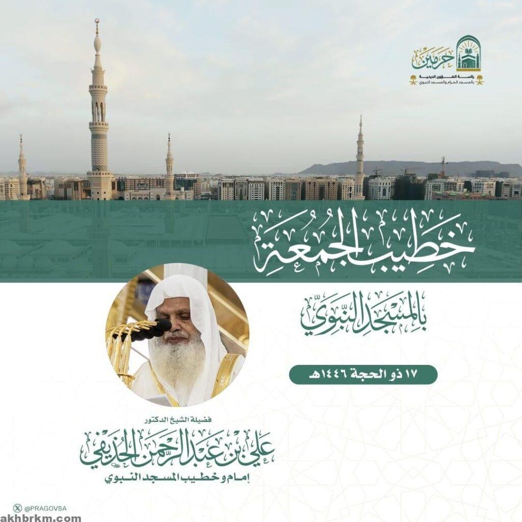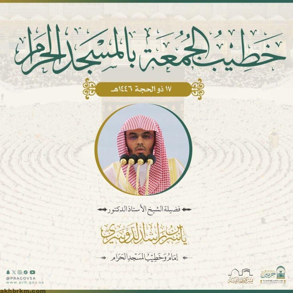 اعلنت رئاسة الشؤون الدينية بالمسجد الحرام والمسجد النبوي إمام وخطيب الجمعة ليوم الجمعة الموافق 17 ذو الحجة 1446هـ في الحرمين الشريفين.