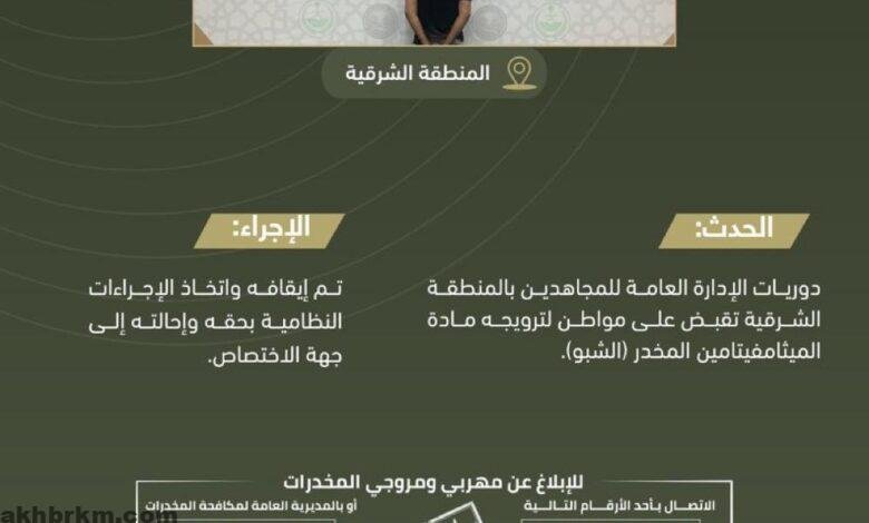 دوريات المجاهدين تلقي القبض على شخص لترويجه مادة الشبو بالمنطقة الشرقية