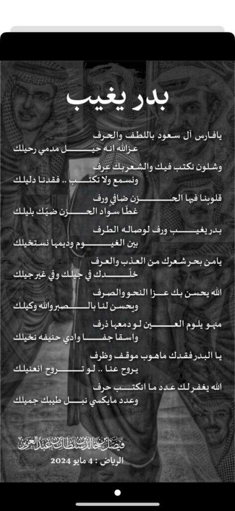 سجّل أمير منطقة الحدود الشمالية الأمير فيصل بن خالد بن سلطان قصيدة في رثاء الأمير الراحل بدر بن عبدالمحسن.