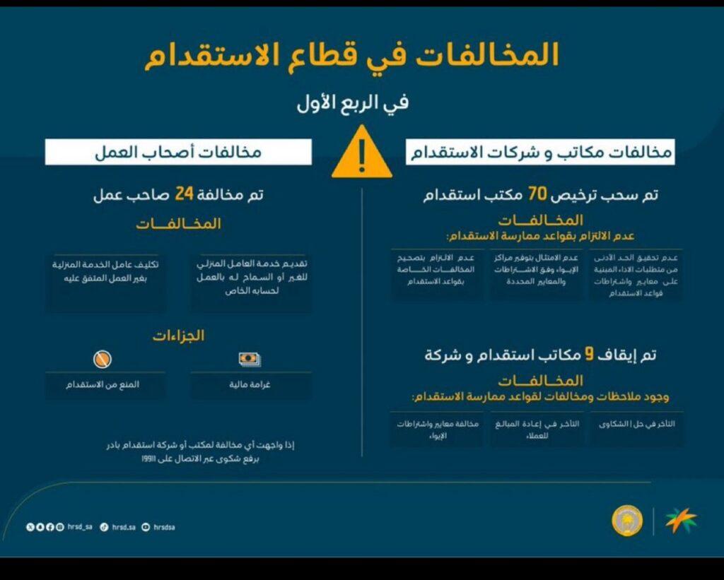 وأوضحت الوزارة أن فرقها رصدت 24 مخالفة لأصحاب العمل تضمنت تقديم خدمة عامل منزلي للغير أو السماح له بالعمل لحسابه الخاص، فيما سحبت الترخيص من سبعين مكتباً لعدم تحقيق الحد الأدنى من متطلبات الأداء المبنية على معايير واشتراطات قواعد الاستقدام، وعدم الامتثال بتوفير مراكز الإيواء وفق المعايير والاشتراطات المحددة، ومخالفة عدد من مواد قواعد الاستقدام وعدم تصحيح هذه المخالفات.