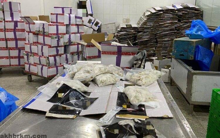 واشتملت المضبوطات على 264 طن مأكولات بحرية (أسماك، روبيان، كراب ستيك، كابوريا) منها كميات مجهولة المصدر وأخرى مستوردة، وأكثر من 800 ألف عبوة تستخدم بغرض تعبئة تلك المنتجات.