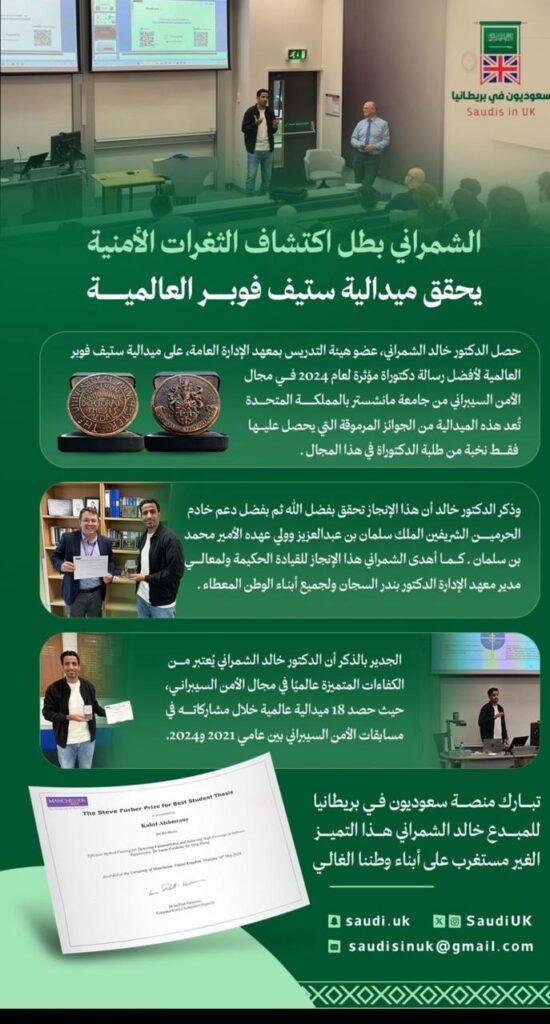 حصل الدكتور خالد الشمراني، عضو هيئة التدريس بمعهد الإدارة العامة، على ميدالية ستيف فوبر العالمية لأفضل رسالة دكتوراه مؤثرة لعام 2024 في مجال الأمن السيبراني من جامعة مانشستر بالمملكة المتحدة.