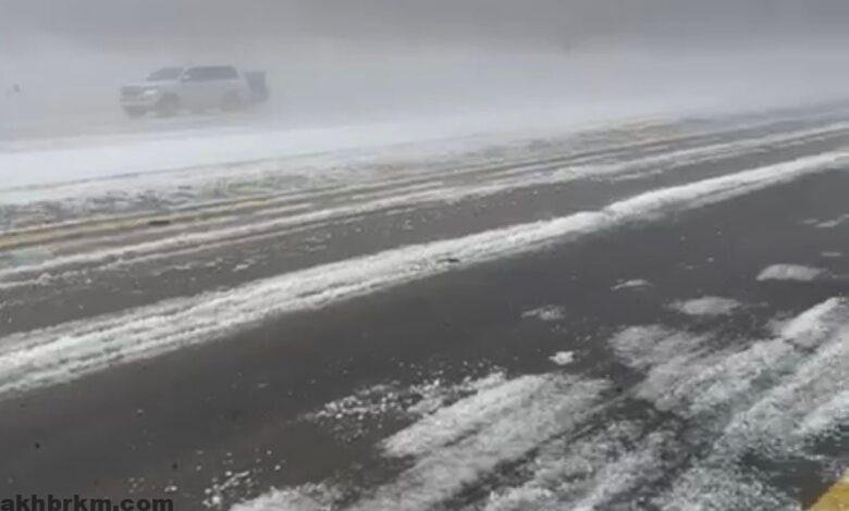 وأظهرت الصورة المتداولة تأثّر أحد الطرق السريعة بتجمّعات البَرَد، ما أدى إلى بطء الحركة المرورية وتوقف بعض المركبات على جانبي الطريق، وسط أجواء غائمة وانخفاض ملحوظ في درجات الحرارة. وقد باشر عدد من قائدي المركبات توخي الحيطة والحذر، فيما بدت آثار الحالة الجوية واضحة على سطح الطريق.
