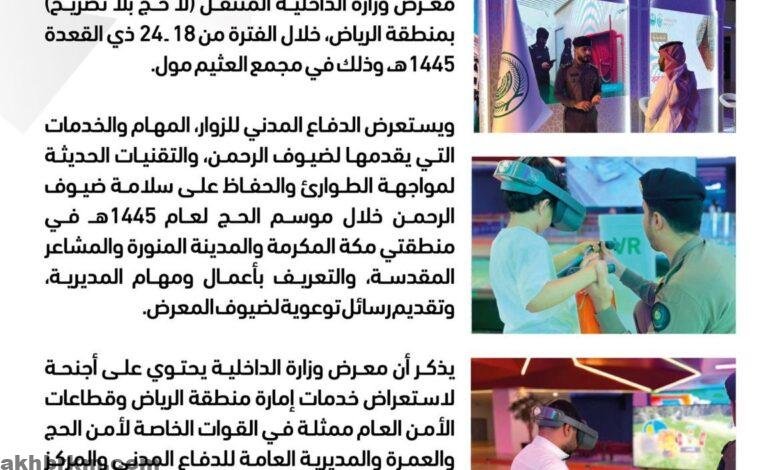 تشارك المديرية العامة للدفاع المدني ضمن معرض وزارة الداخلية المتنقل (لا حج بلا تصريح) بمنطقة الرياض، خلال الفترة من 18 ـ 24 ذي القعدة 1445هـ، وذلك في مجمع العثيم مول.