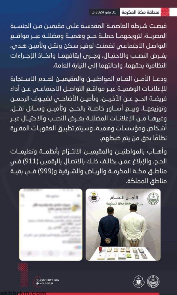 القبض على مقيمين بـ العاصمة المقدسة لترويجهما حملة حج وهمية ومضللة بتوفير سكن ونقل وتأمين هدي بغرض النصب والاحتيال