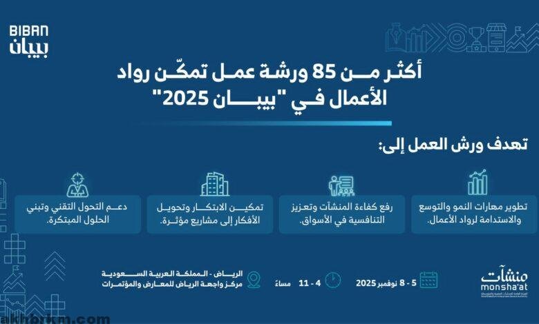 يحتضن ملتقى “بيبان 2025″، الذي تنظمه الهيئة العامة للمنشآت الصغيرة والمتوسطة “منشآت” خلال الفترة من 5 إلى 8 نوفمبر المقبل في مركز واجهة الرياض للمعارض والمؤتمرات، تحت شعار “وجهة عالمية للفرص”، أكثر من (85) ورشة عمل متخصصة تهدف لتمكين رواد الأعمال وأصحاب المنشآت الصغيرة والمتوسطة من نمو وتوسع واستدامة مشاريعهم؛ عبر مسارات معرفية وتطبيقية متنوعة وفقًا لأحدث التوجهات العالمية في ريادة الأعمال.