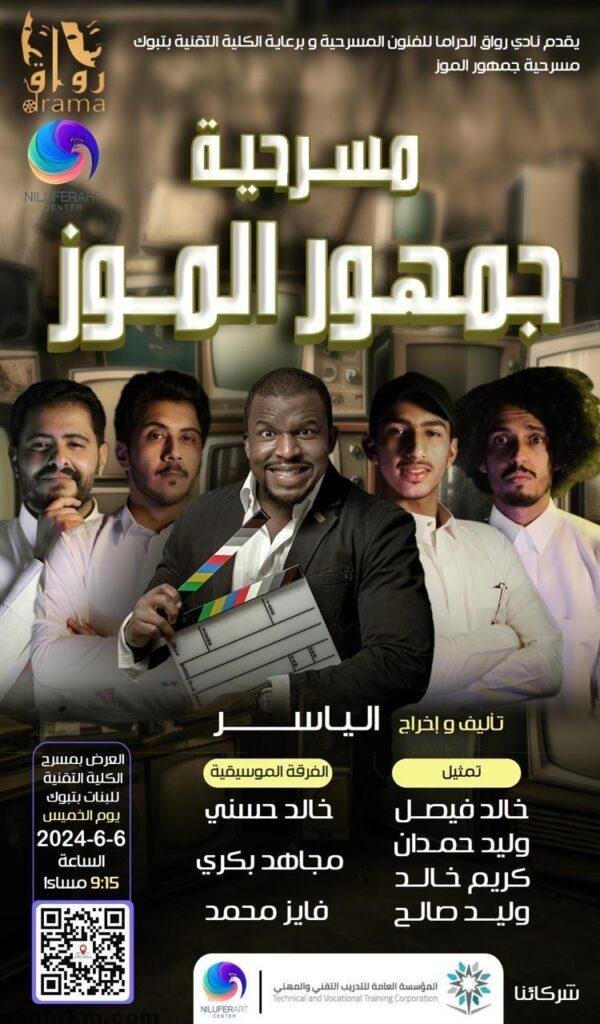 مسرحية جمهور الموز بمرافقة الفرقة الموسيقية لمركز نيلوفر للفنون علي مسرح الكلية التقنيه للبنات بتبوك مساء غدا الخميس حيث يرفع الستار في تمام الساعة التاسعه والربع مساءاً