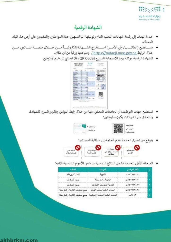 أطلقت وزارة التعليم خدمة الشهادة الرقمية لإصدار شهادات التعليم العام وتوثيقها دون الحاجة إلى طباعة الأصل الورقي وختمه والمصادقة على صوره طبق الأصل،