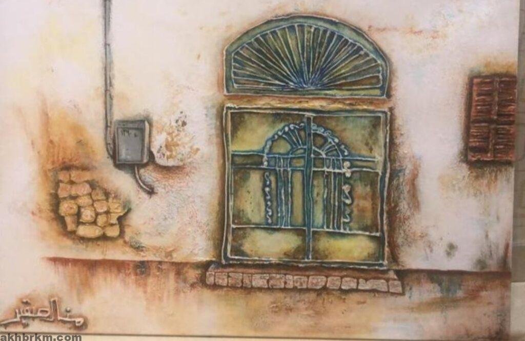 بحيث استخدمت ألوان الأكريلك لتعبر عن واجهة منزل قديم جمعت تفاصيله من بيوت عدة لتبرز بعض تفاصيل الباب وما يحيط به باستخدام الألوان الأزرق والأخضر والأصفر والبني وتدرجاتهم في توزيع أعاد الزمن الماضي بلمسة بسيطة