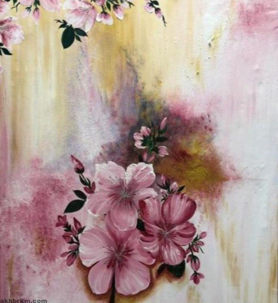 رسمت أزهار الخوخ والذي تشتهر به منطقة تبوك بألوان الأكريلك لتكون مجموعة منها في المنتصف بلمسات من اللون الزهري الممتزج مع الأبيض والتي ترتكز على خلفية غامقة من اللون البني الذي يرمز لصحراء تبوك المحيطة بها بينما تتدلى بعض الزهرات من الأعلى لتطل على المتأمل لها بلمسة حانية