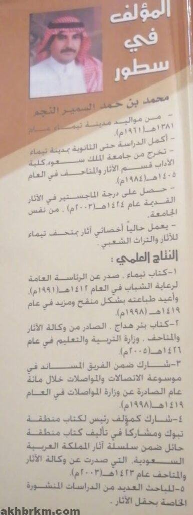 هذا الكتاب هو باكورة أعمالي في التأليف طبعا له قصة ففي العام 1409وقع الاختيار علي بالكتابة عن آثار تيماء من قبل الرئاسة العامة لرعاية الشباب انذاك (وزارة الرياضة حاليا )حيث كانت التعليمات واضحة وصريحة بأن لا يؤلف عن اي منطقة إلا احد أبنائها فكانت الرئاسة العامة لرعاية الشباب (وزارة الرياضة)وقتها تضم قسم خاص بالنشاطات الثقافية والمتاحف فتم تكليفي بشكل مباشر بالكتابة عن آثار تيماء ومحافظة تيماء بشكل خاص فكان هذا الكتاب اول كتاب يصدر عن تيماء بشكل عام
