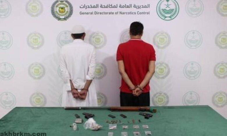 قبضت المديرية العامة لمكافحة المخدرات على مواطنين بمنطقة تبوك لترويجهما مادتي الحشيش والإمفيتامين المخدرتين، وجرى إيقافهما واتخاذ الإجراءات النظامية بحقهما، وإحالتهما إلى النيابة العامة.