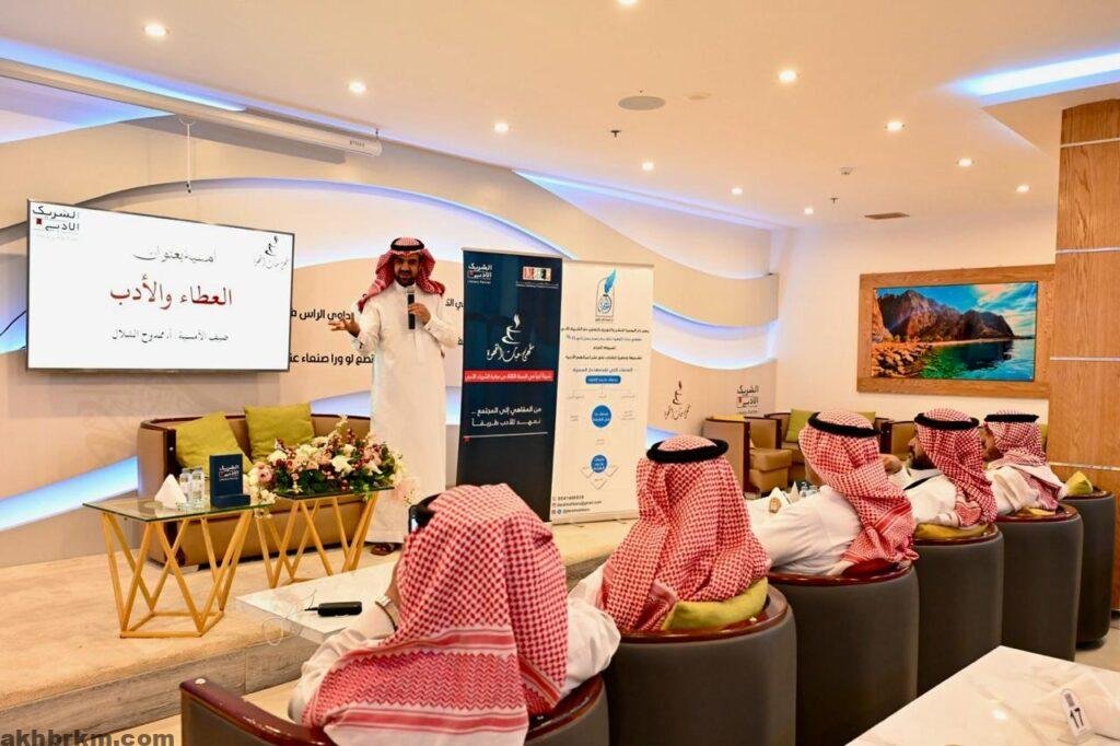 حيث اكد في أمسيتة علي أن العطاء والادب عنصرين حاسمين لتحقيق التكامل الادبي والتقدم الشامل في المجتمع وفي شخصية الفرد الداخلية لتحقيق ما يصبو إلية قبل أن يعرج الي ماهو العطاء وماهي انواعه وماهي مقوماته وأسبابه. وكيف يتخلص الإنسان من الشخصية السلبية العقيمة في عطاءها للمجتمع وتحويلها الي شخصية إيجابية فعاله في مجتمعه وقبل ذلك في المحيطين به من أهل وأصدقاء وزملاء .