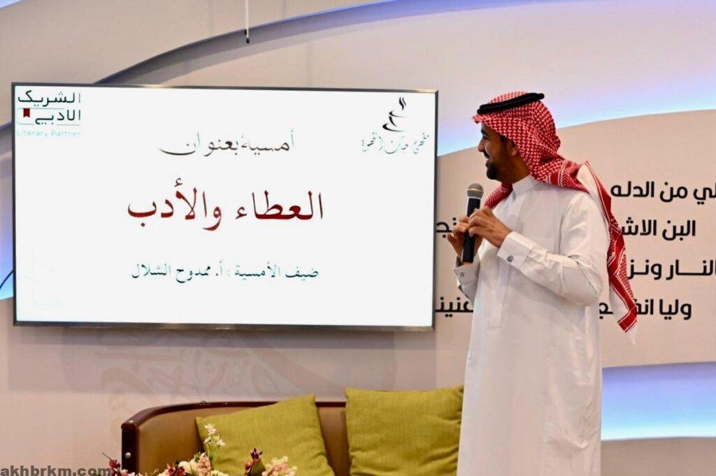 قبل أن يختتم الأمسية الثقافية بالتأكيد على أهمية النية في العطاء وجعله خالص لوجه الله والبعد عن كل ما يوثر علي العطاء في حياتنا كذلك عدم اهتزاز . الشخصية عند اتخذ امر العطاء فأنت فقط من يقرر وليس غيرك من يرسم طريقة عطاك في الحياة .