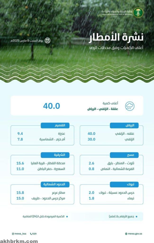 ووفقًا للتقرير اليومي لوزارة البيئة والمياه والزراعة، حول كميات هطول الأمطار في مناطق المملكة كافة، سجّلت (83) محطة رصد هيدرولوجي ومناخي، خلال الفترة من الساعة التاسعة صباح الجمعة 7 مارس وحتى التاسعة صباح السبت 8 مارس 2025م، هطول أمطارٍ في مناطق (الرياض، مكة المكرمة، المدينة المنورة، القصيم، الشرقية، عسير، تبوك، الحدود الشمالية، الباحة، والجوف).