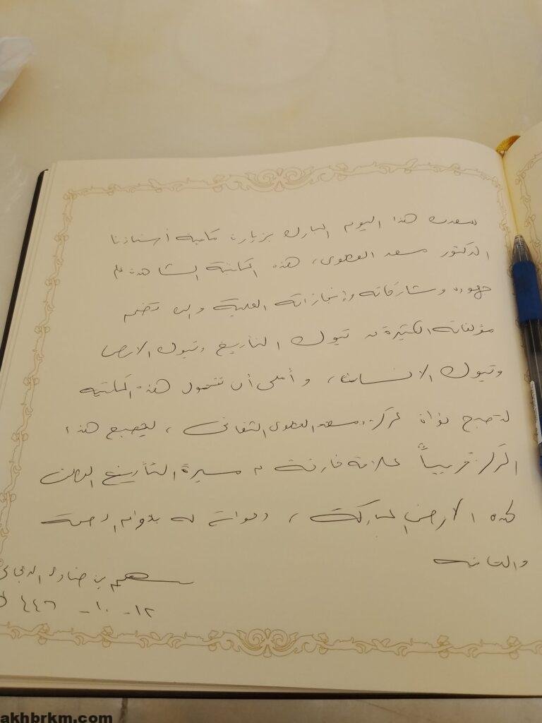 وفي ختام الزيارة، سجل الأستاذ سهم الدعجاني كلمة في سجل الزوار، حيث اقترح تحويل المكتبة إلى مركز ثقافي يحمل اسم الدكتور مسعد العطوي، تقديرًا لإسهاماته العظيمة في مجال الثقافة والأدب.