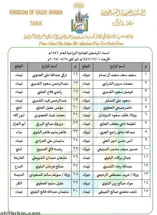 اعتمد صاحب السمو الملكي الأمير فهد بن سلطان بن عبدالعزيز، أمير منطقة تبوك، أسماء الفائزين بجائزة الأمير فهد بن سلطان للمزرعة النموذجية في دورتها الـ34، والتي سيتم تكريمهم خلال الحفل الذي يرعاه سموه يوم الأربعاء المقبل.