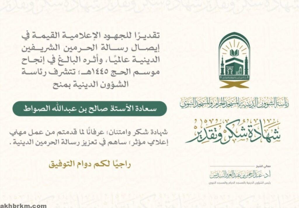 تلقى الزميل الاعلامي بصحيفة اخباركم الإلكترونية ” صالح بن عبدالله الصواط” شهادة شكر وتقدير من رئاسة الشؤون الدينيه بالمسجد الحرام والمسجد النبوي، تقديرآ لجهوده الإعلاميه القيمه والبارزة في إيصال رسالة الحرمين الشريفين وأثره البالغ في إنجاح موسم الحج لعام 1445