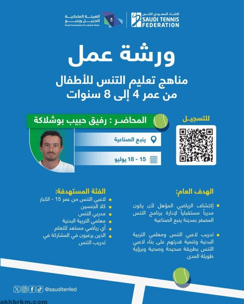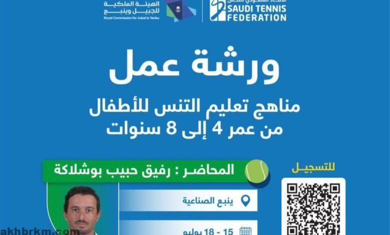 يقيم الاتحاد السعودي للتنس بالتعاون مع الهيئة الملكية للجبيل وينبع ورشة عمل للمدربين في مناهج تعليم التنس للأطفال من عمر 4 إلى 8 سنوات في مدينة ينبع الصناعية، خلال الفترة من 15-18 يوليو الحالي.