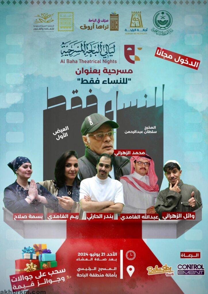 الباحة- يشهد مسرح أمانة منطقة الباحة مساء الأحد القادم ١٤٤٦/١/١٥ العرض الأول من مسرحية “للنساء فقط” بطولة الفنان محمد الزهراني ، والفنان عبد الله الغامدي ، والفنان بندر الحارثي ،والفنان وائل الزهراني، والفنانة ريم الغامدي ، والفنانة بسمة صلاح، والتي جاءت ضمن برنامج “ليالي الباحة المسرحية الذي تنظمه الأمانة بالتعاون مع جمعية الثقافة والفنون، والقطاع الخاص وذلك خلال المدة من 21 إلى 27 يوليو المقبل. ويقام ضمن مهرجان” صيف في الباحة تراها أروق ” ويتضمن عروضا مسرحية يشارك فيها أبرز النجوم الكبار من خارج المنطقة بمشاركة فنانين من أبناء وبنات الباحة يطلون على الجمهور والزوار عبر 7 عروض مسرحية تقدم- للمرة الأولى- في منطقة الباحة.