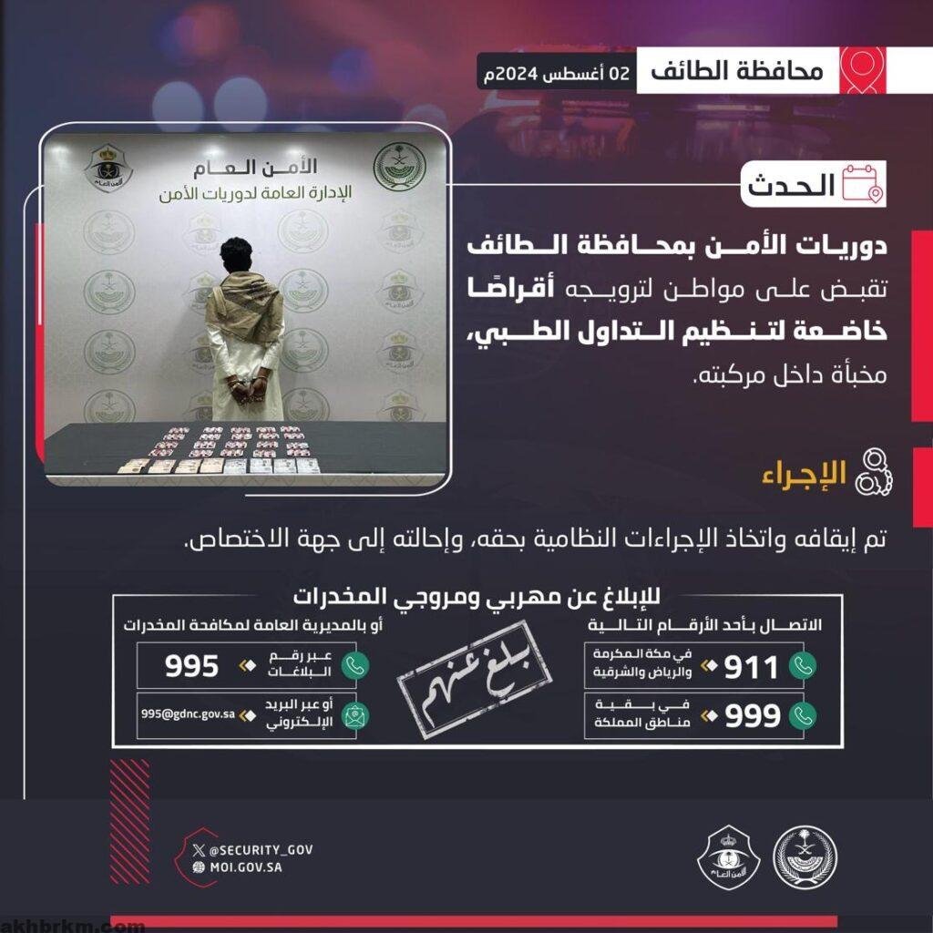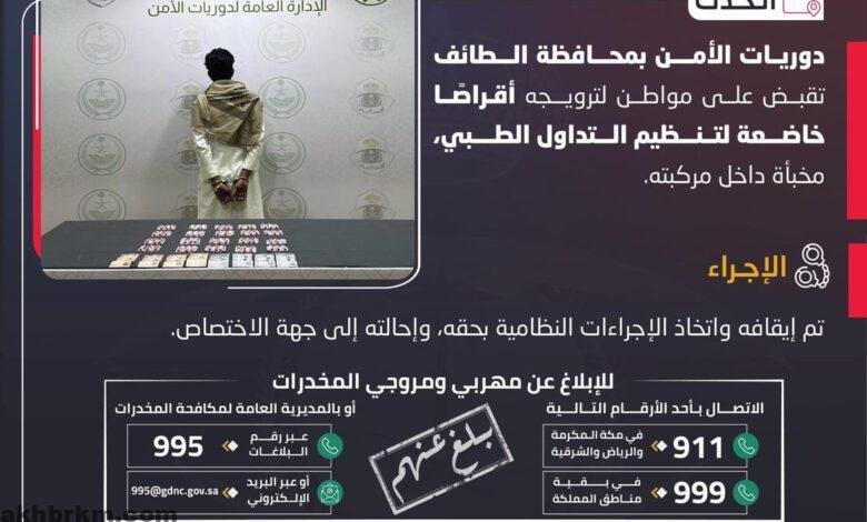 قبضت دوريات الأمن بمحافظة الطائف على مواطن لترويجه أقراصًا خاضعة لتنظيم التداول الطبي .