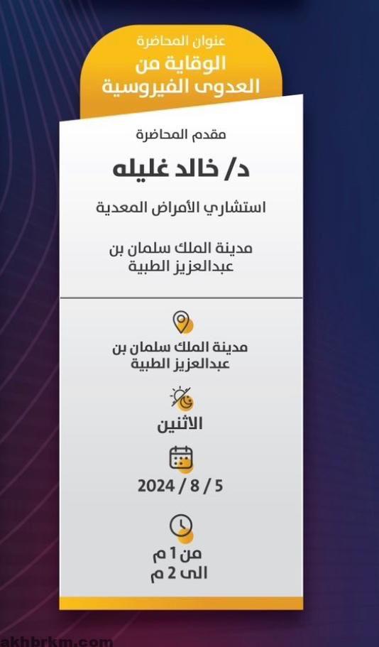 يوم الاثنين الموافق 2024/08/05م من الساعة الواحدة مساءً إلى الساعة الثانية مساء يقدم المحاضرة استشاري الأمراض المعدية د/ خالد غليله ، بمقر مدينة الملك سلمان بن عبدالعزيز الطبية بالمدينة المنورة ويصاحب المحاضرة معرض توعوي للتثقيف والتوعية حول امراض الكبد الوبائي وفحوصات مجانية فورية لكافة افراد المجتمع تبداء من الساعة ٨:٣٠ص إلى الساعة ٢ مساءً وتتزامن هذه البرامج التي تقيمها جمعية كبدك توافقاً مع اليوم العالمي لالتهاب الكبد الوبائي.