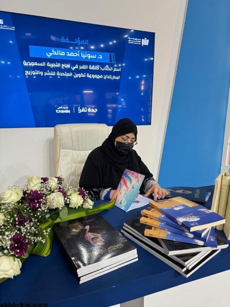 ومن على منصة التواقيع، شاركت الكاتبة الدكتورة سونيا أحمد مالكي في توقيع كتابها الأخير عن الملك عبد العزيز – طيب الله ثراه – والموسوم بـ “كلمة السر في نجاح التجربة السعودية” الذي قدمت إهدائه إلى صاحب السمو الملكي ولي العهد رئيس مجلس الوزراء وأيقونة الشباب السعودي الأمير محمد بن سلمان، وبالتعاون مع المؤرخ الدكتور إبراهيم فؤاد عباس، وقدمت له سمو الأميرة الدكتورة الجوهرة بنت فهد بن محمد آل عبد الرحمن آل سعود، أول مديرة لجامعة الأميرة نورة بنت عبد الرحمن، وطرزته ريشة الفنانين السعوديين المبدعين الأستاذ ضياء عزيز ضياء والأستاذ أحمد المغلوث.