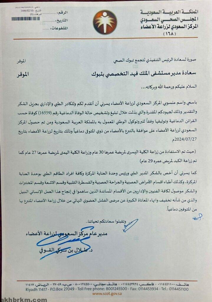 المركز السعودي لزراعة الأعضاء يشكر مستشفى الملك فهد التخصصي بتبوك