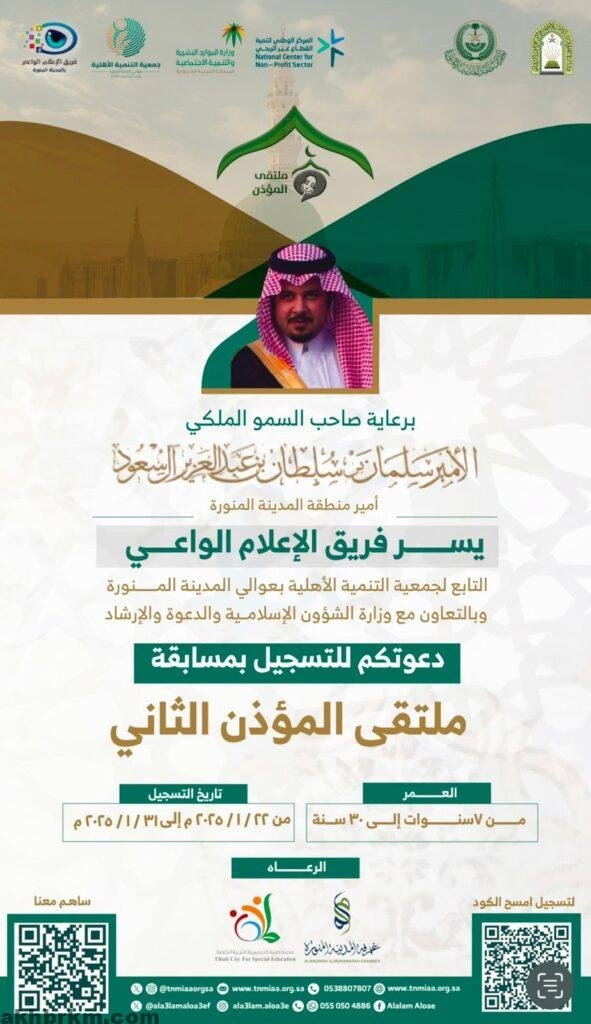 انطلقت مسابقة “ملتقى المؤذن الثاني ” لعام 2025 برعاية كريمة من صاحب السمو الملكي الأمير سلمان بن سلطان بن عبدالعزيز آل سعود أمير منطقة المدينة المنورة، وبالتعاون مع وزارة الشؤون الإسلامية والدعوة والإرشاد، حيث أطلق فريق الإعلام الواعي التابع لجمعية التنمية الأهلية بعوالي المدينة المنورة نسختها الثانية من المسابقة. وتعد هذه المسابقة الأولى من نوعها، إذ تمثل برنامجًا تدريبيًا متكاملاً تحت إشراف لجنة تدريب وتحكيم متخصصة، وتُعنى بتعزيز مهارات الأذان وترسيخ هذه الشعيرة المباركة لدى الأجيال القادمة.