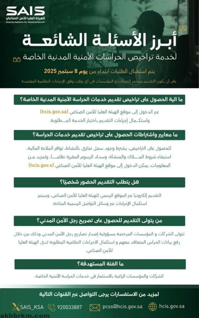 أعلنت الهيئة العليا للأمن الصناعي عن بدء استقبال طلبات تراخيص “الحراسة الأمنية المدنية الخاصة” اعتبارًا من 16 ربيع الأول 1447هـ الموافق 8 سبتمبر 2025م، وذلك عبر منصة الهيئة الإلكترونية (hcis.gov.sa).