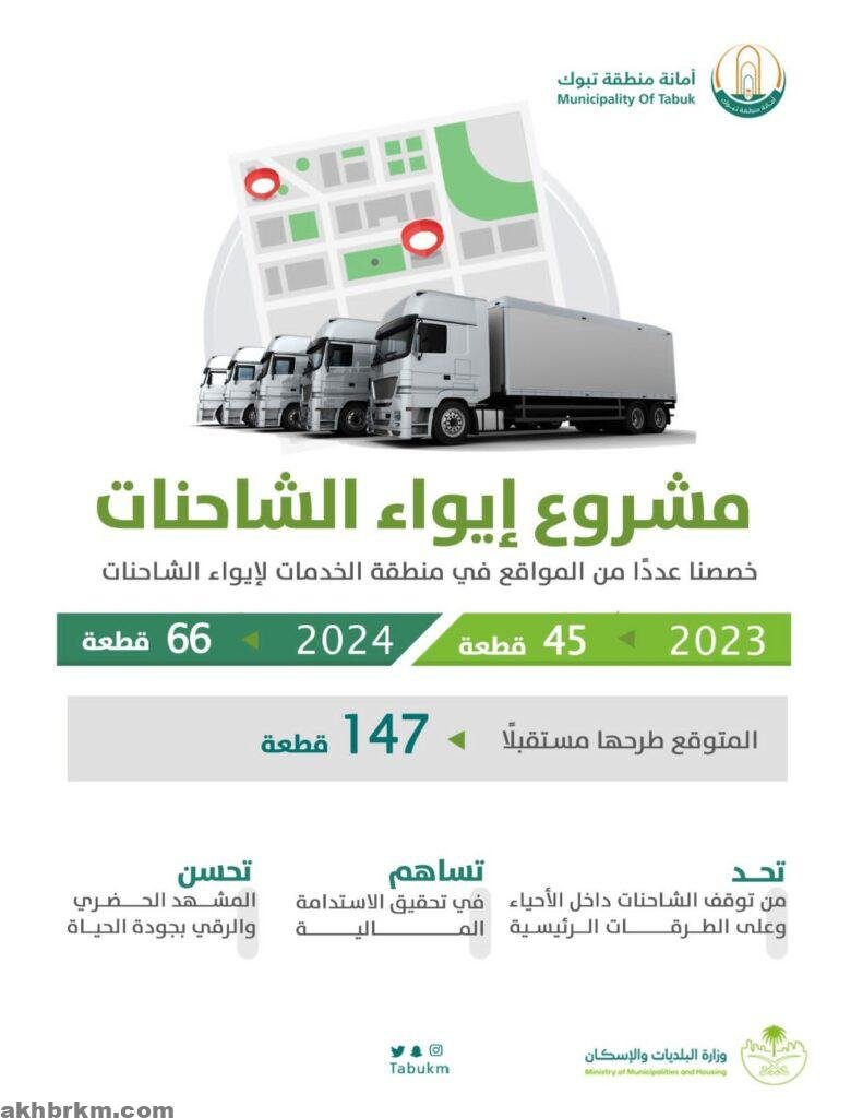 أمانة منطقة تبوك تخصص أكثر من ١٠٠ قطعة لإيواء الشاحنات في منطقة الخدمات.