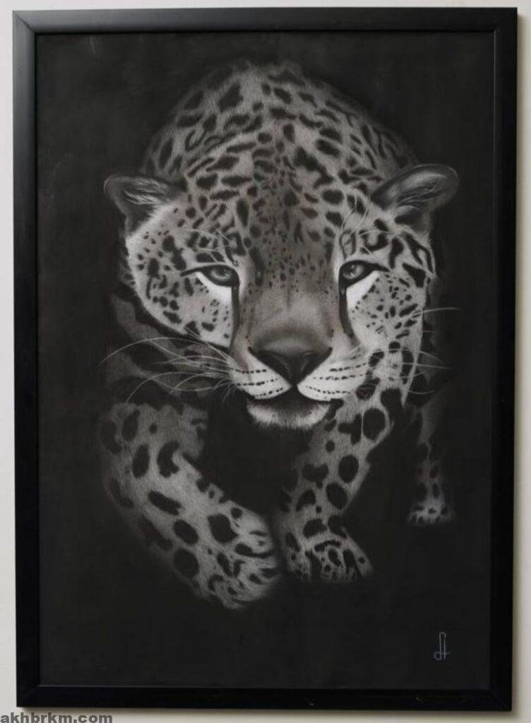 اول اعمالي الفنيه النمر العربي وهو العمل الذي يمثل شخصيتي بحجم 100/70 بمادة الفحم واستخدمت فيها الابره في إبراز واقعية الشع🐆
