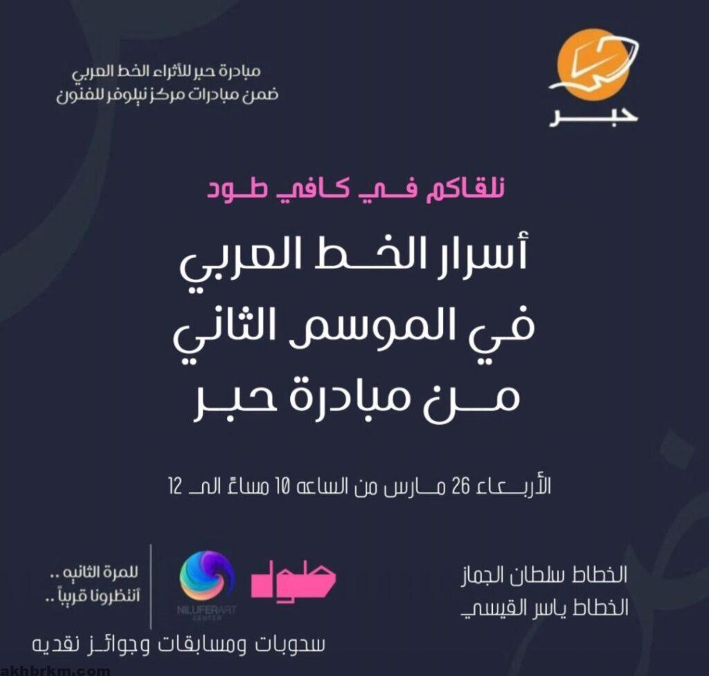 نضم مركز نيلوفر للفنون مبادرة حبر لأثر الخط العربي في موسمها الثاني والتي تستمر علي مدي يومين متتاليين الاربعاء والخميس 28/27 من مارس والتي تهدف في مجملها الي الغوص في اسرار الخط العربي باقسامه المختلفة والمتنوعة كخط النسخ والرقعة والثلث والكوفي والفارسي والديواني وغيرهم من أنواع الخطوط العربي وكشف غموضه كذلك ما يحتويه من جماليات في جميع أقسامه .