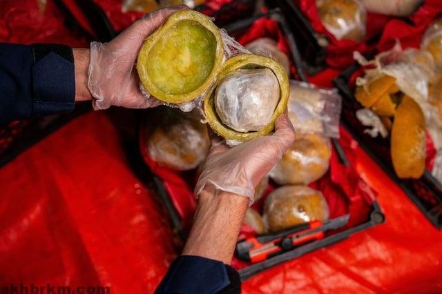 وأوضحت الهيئة أنه عند إجراء عملية الكشف والمعاينة لإحدى الشاحنات القادمة عبر المنفذ، عُثر على تلك الكمية من الحبوب مخبأة داخل إرسالية شمام، وذلك بإخفاء الحبوب في تجويف ثمار الشمام، وتغليفها.