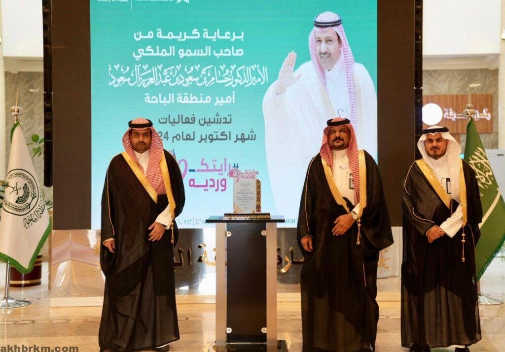 دشن سعادة وكيل الإمارة المساعد للشؤون التنموية المهندس جديع القحطاني فعاليات شهر أكتوبر لعام ٢٠٢٤ م ، وذلك بحضور مدير عام فرع وزارة الصحة بمنطقة الباحة الدكتور عبدالدايم بن محمد العنزي ، والرئيس التنفيذي لتجمع الباحة الصحي الدكتور مشبب بن سعيد الأسمري في إمارة المنطقة.